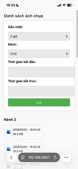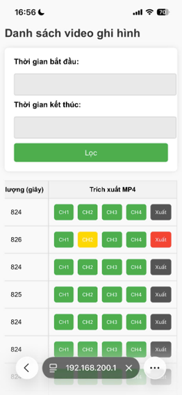 Có thể lựa chọn lọc theo thời gian bắt đầu và kết thúc. Ban đầu, khi chưa áp dụng lọc, danh sách sẽ hiển thị tất cả video đã lưu trong thẻ nhớ. Ở danh sách video ghi hình, tại cột “Trích xuất MP4”, các nút chọn kênh cho phép xuất các tệp video ghi hình định dạng MP4 trên các kênh cần trích xuất. Nút chọn kênh màu xanh lá cây thể hiện các kênh đó chưa được xuất trong vòng 3 ngày gần nhất. Ngược lại, nút chọn kênh màu xanh dương thể hiện các kênh đó đã được xuất gần đây.
