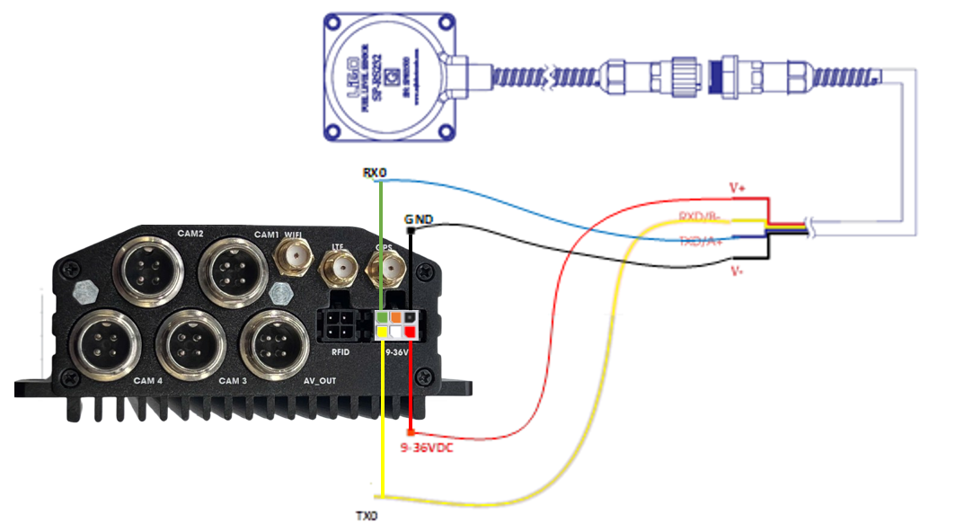 Kết nối cảm biến Sơ đồ kết nối¶ Yêu cầu cấu hình¶ Cần gửi các lệnh sau đến GT-MDVR02 Plus để thiết lập kết nối: Rs232,0,2,115200# Rs232para,0,10,5# Syscmdexe,reboot# Về phía cảm biến cần cấu hình lại như sau, đặc biệt lưu ý về baudrate Note Cảm biến sau khi được cấu hình xong cần khởi động lại nguồn để nhận cấu hình mới.